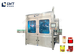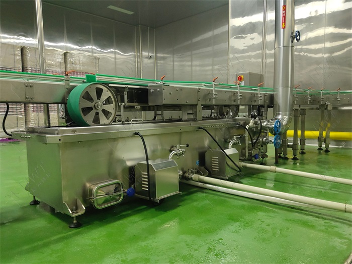 清洗 -> 2. 去皮 -> 3. 打漿/破碎 -> 4. 調配 -> 5. 融糖 -> 6. 均質 -> 7. 預熱 ->8. 空罐卸垛 -> 9. 空罐清洗(高壓噴淋) -> 10. 空罐吹干/瀝干 ->11. 自動灌裝 -> 12. 抽真空/蒸汽噴射(排除罐頂空氣) -> 13. 真空封口 ->14. 殺菌  -> 15. 冷卻 -> 16. 吹干(去除表面水漬)-> 17. 噴碼 -> 18. 貼標 -> 19. 自動開箱 -> 20. 自動裝箱 -> 21. 自動封箱 -> 22. 機器人碼垛 -> 23. 成品入庫